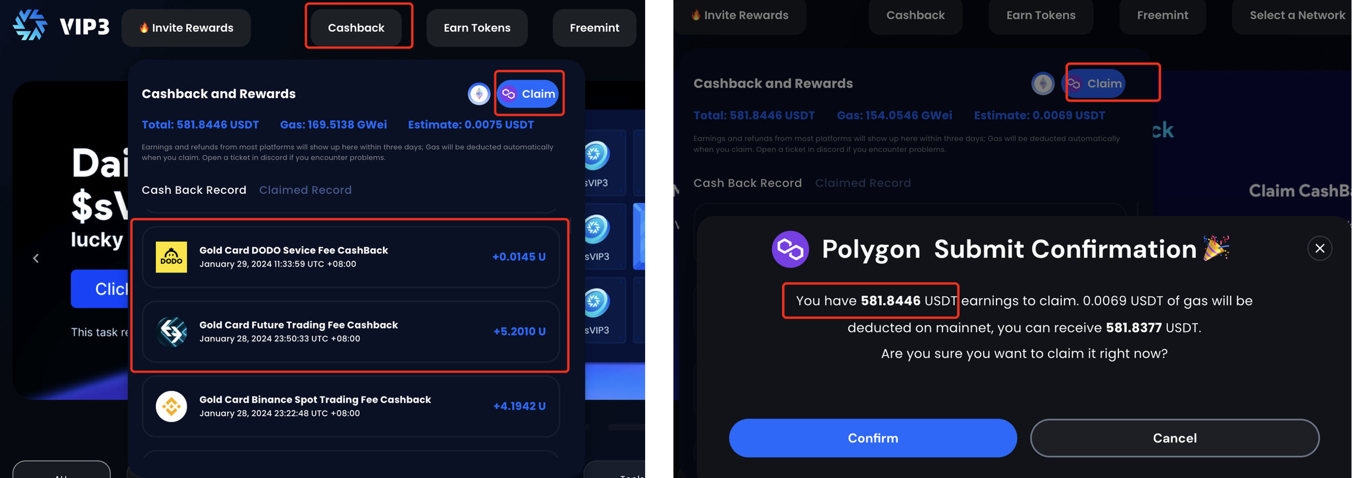 3\. Claim CashBack at <https://dapp.vip3.io/>