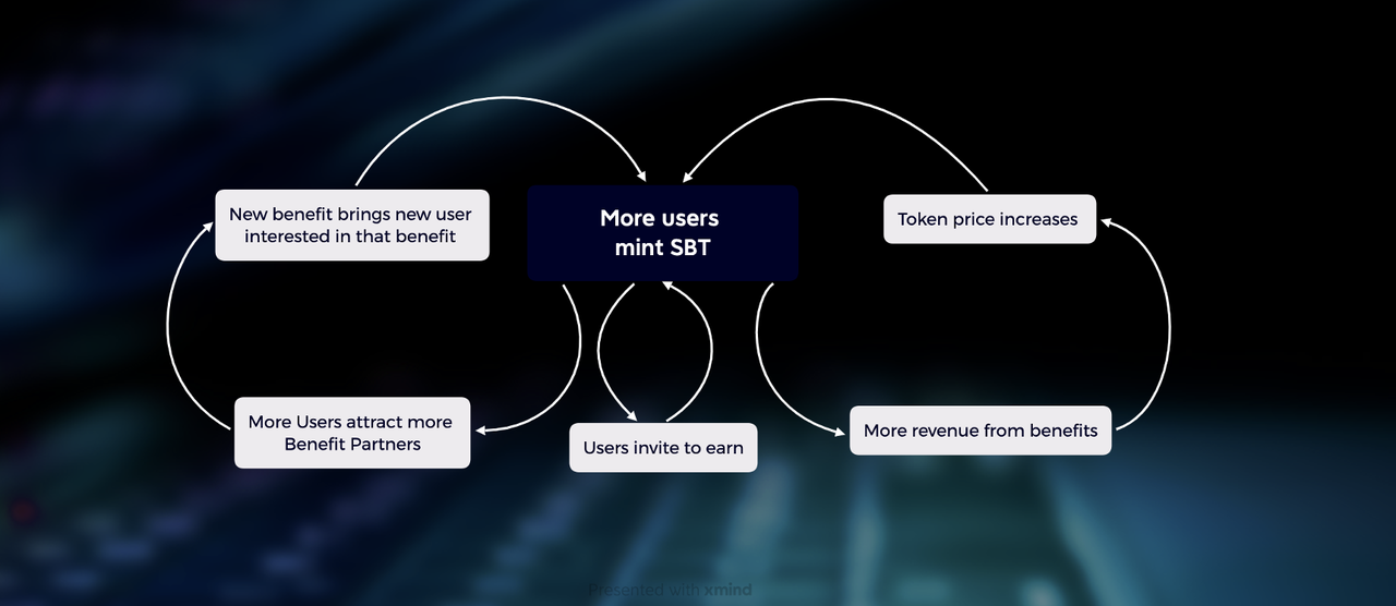 Secondly, as more users utilize the benefits of the VIP3 platform, more CashBack funds are generated for the repurchase of VIP3 tokens. The increase in token repurchases will drive up the token price, making the VIP3's Invite2Earn model more attractive, thereby attracting more users to join. This constitutes a second positive flywheel: an increase in users leads to more usage of benefits, which drives up token price, attracting even more users. This flywheel enables the VIP3 community and its users to gain more benefits.