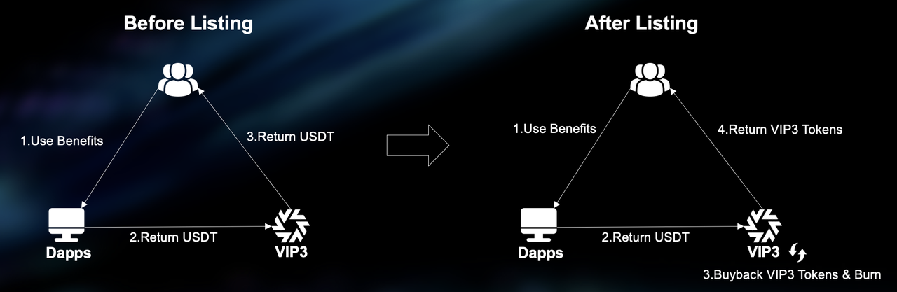 As VIP3 grows and the user base expands, following the listing of $VIP3, a new incentive model is being considered. This model will shift from directly giving USDT to users to returning an equivalent value in VIP3 Tokens (without the risk of loss for users). If users need USDT, they can obtain it through direct trading. Holding the token also allows users to benefit from potential price increases. The USDT originally provided by partners to VIP3 will be used to continuously buy back and burn VIP3 Tokens on the open market. This process leads to the continuous deflation of the $VIP3 Token, thereby providing strong upward momentum for the price of $VIP3. The specific details of this model, including the shift in process post-listing, can be referenced in the 'After Listing' stage of diagram 3.In summary, this new incentive model post-listing aims to enhance the value of $VIP3 by: