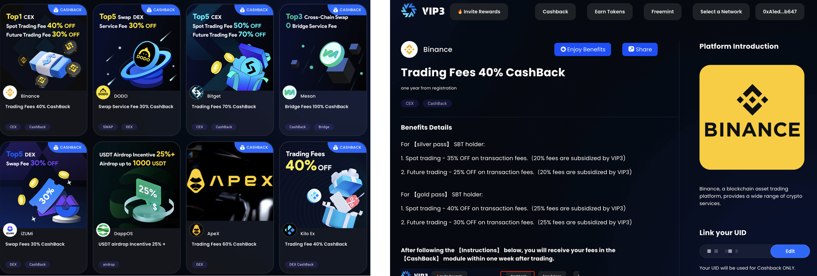 * VIP3's core benefits mainly take the form of commissions/rebates. For instance, when users trade on Binance, Binance regularly pays the agreed fees to VIP3. Then, VIP3 disburses the actual funds that users are entitled to through the CashBack section. Users can regularly collect their funds from the CashBack section.
